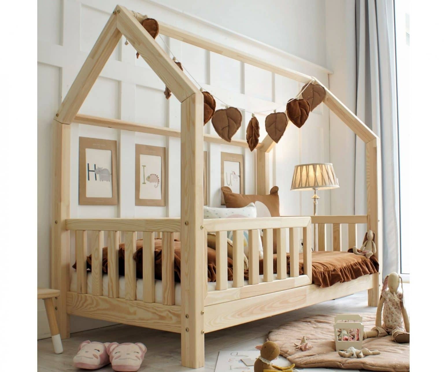 La cama casita Oslo con barrera ofrece a tu hijo un auténtico refugio escandinavo. Su estructura en forma de casita estimula la imaginación, creando el lugar perfecto para sueños y aventuras nocturnas.